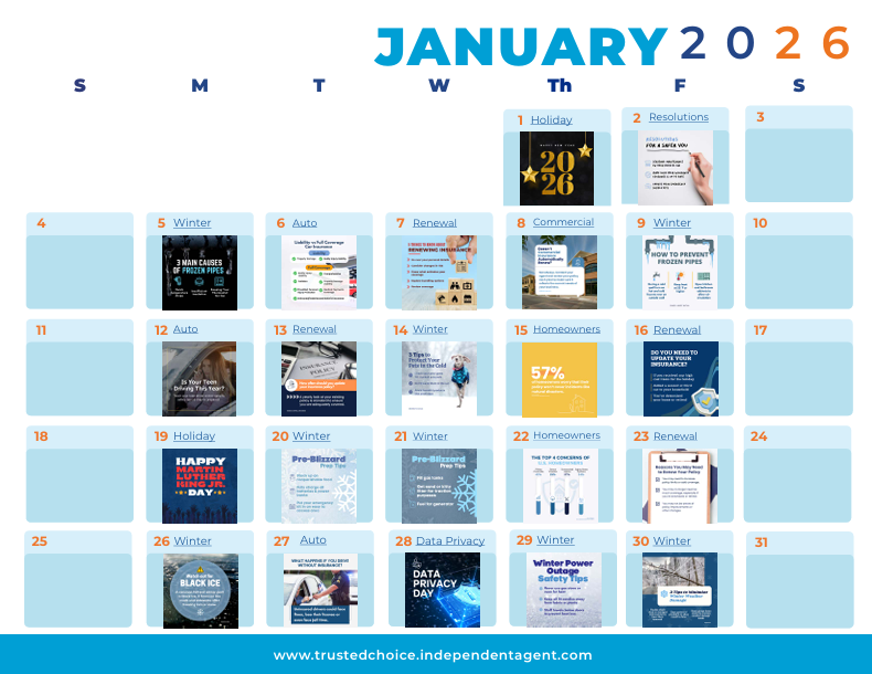 The calendar includes ready-made photos and captions to share surrounding holidays, seasonal insurance advice, etc.